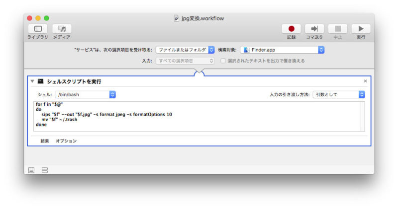 一つずつ取り出しては sips(Scriptable Image Processing System) コマンドを使ってjpgに変換、クオリティは10%(かなり圧縮率高め)で処理し、終わったら元の画像はゴミ箱へと移動、という流れ。
