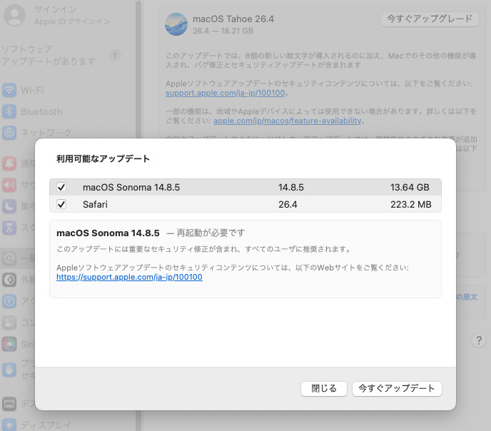 macOS Sonoma 14.8.5 へのアップデートが来ていたようなので作業します。