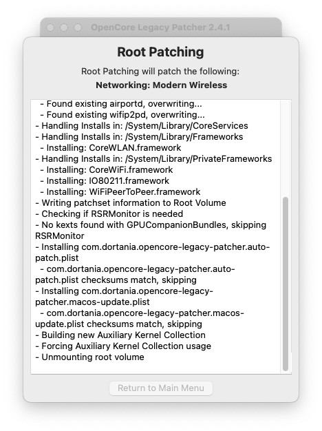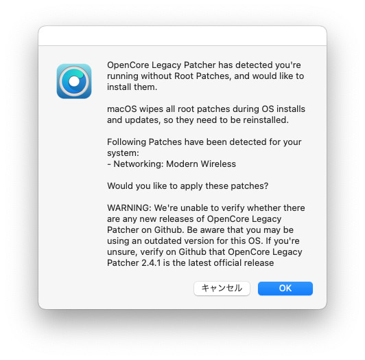 再起動後、OCLPがRootパッチを当てるよう言ってくるので再インストールします。
